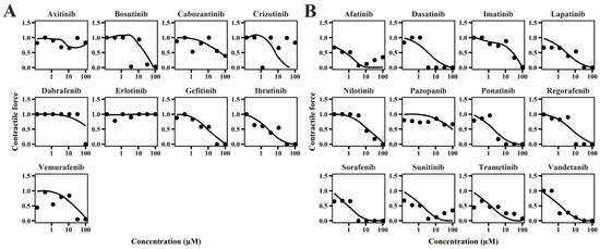 Individual plots of TKIs on contractile force of hiPSC-CMs for TKIs with no cardiotoxicity (A) and TKIs with cardiotoxicity (B).