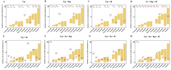 Initial estimates based solely on plasma drug concentration significantly overestimated the incidence rates of cardiac dysfunction, emphasizing the importance of considering unbound plasma drug concentration for accurate predictions. As shown in Figure 4, excluding fu led to overpredictions, while including it improved accuracy. Although adding Kp and/or H resulted in modest improvements, combining all three factors (fu, Kp, and H) yielded the best predicted incidence rates. Vandetanib was an exception, with a clinical incidence rate of 0.9%. The model predicted 5.84% using plasma-free drug concentration, which increased to 8.32% with H and over 20% with Kp, indicating that the overestimated Kp value was the main contributor to the overprediction of vandetanib’s incidence rate of cardiac dysfunction.