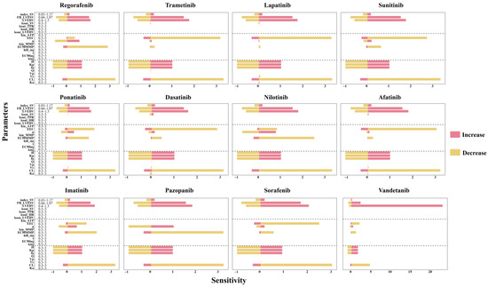 The sensitivity of the parameter was set as the changes in typical values of the parameters (∆pi) and changes in the LVEF (∆LVEFchange) caused by changes in typical values during one year of TKI administration. Sensitivity was calculated by Equation (22).