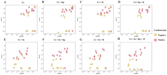 When plasma drug concentration was used to calculate PK-TD parameters, AEAAC and AEMMP had limited ability to distinguish cardiotoxic from noncardiotoxic TKIs (Figure 6). However, incorporating additional factors, such as the tissue–plasma partition coefficient, plasma-free fraction, and a heterogeneity factor, improved the accuracy of AEAAC and AEMMP to identify cardiotoxic drugs. Among these factors, Kp demonstrated superior discriminative ability compared to plasma-free fraction and the heterogeneity factor, with vemurafenib being the only TKI misclassified. The combination of fu, Kp, and H successfully differentiated cardiotoxic from noncardiotoxic TKIs. As illustrated in Figure 6, cardiotoxic TKIs exhibited higher AEAAC and AEMMP values compared to noncardiotoxic TKIs, highlighting the predictive value of these parameters for assessing the risk of cardiotoxicity.