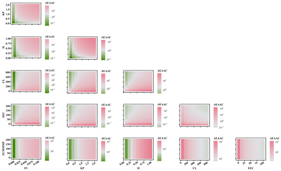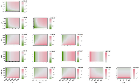 To further elucidate the relationship between AEAAC, AEMMP, and the sensitivity of PK-TD parameters, the combined effects of two factors on AEMMP and AEAAC are illustrated in Figure 7 and Figure 8. The results demonstrate that, under the same parameter values, PK-TD parameters have a greater impact on AEAAC than on AEMMP, as evidenced by their respective numerical values. This suggests that AEAAC is more sensitive to changes in PK-TD factors compared to AEMMP. Given that cardiotoxic TKIs exhibit higher AEAAC and AEMMP values, it is evident that smaller AEMMP and AEAAC values correlate with lower cardiotoxicity. Specifically, lower values of fu (free fraction of the drug), Kp (plasma-to-tissue distribution coefficient), and H (drug heterogeneous distribution), combined with higher values of CL (clearance rate), EEC, and EC50MMP, are all associated with significantly reduced AEMMP and AEAAC values. Furthermore, TKIs with low Kp values but high CL values are associated with a reduced cardiotoxicity risk. That indicates that drugs with lower tissue distribution (small Kp) and higher clearance (larger CL) are less likely to accumulate in the heart, lowering the potential for cardiac toxicity.