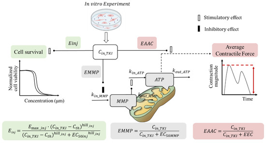 Mitochondrial damage and cardiac fibrosis may underlie TKI-induced cardiotoxicity [8]. The reduction in average contraction force (AAC) due to mitochondrial damage can be mechanistically linked to decreased ATP levels and mitochondrial membrane potential (MMP), as shown in Equations (9)–(11).