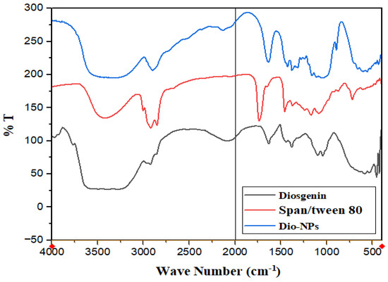FT-IR spectra of diosgenin, span/tween 80, and Dio-NPs.