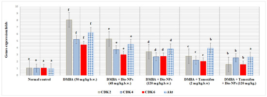 Also, as compared with DMBA-treated mice, the administration of Dio-NPs (48 mg/kg.b.w.) significantly lowered the level of breast CDK2, CDK4, CDK6, and Akt gene expression by 34.61, 28.29, 32.21, and 27.44%, respectively (p < 0.05).