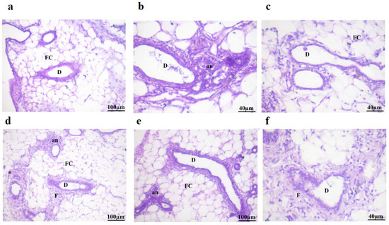 Table 6 and Figure 6 display a microscopy photograph of breast tissues in mice that received treatment. The mammary glands of the control mice had the typical arrangement of the ductal epithelial lining surrounding a limited lumen, together with an exterior layer of myoepithelial cells revealing no histopathological changes to the ducts’ typical histological structure in the adipose tissue (Table 6 and Figure 6a).