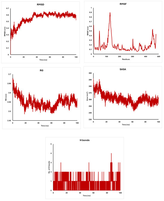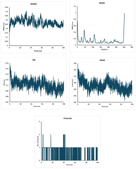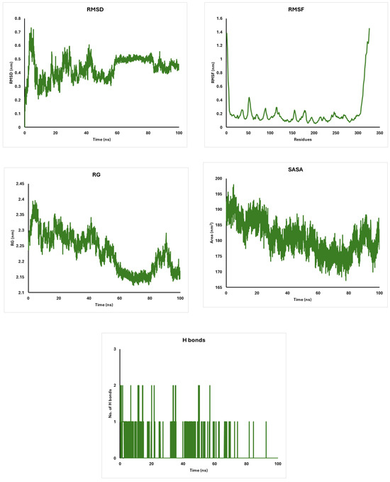 Analysis of Akt-1 with diosgenin: RMSD, RMSF, Radius of Gyration, and Solvent Accessible Surface Area.