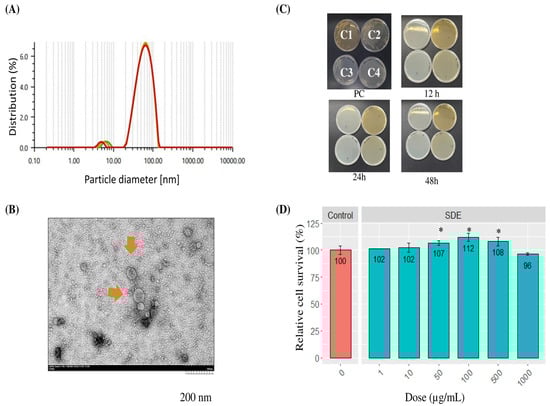 Characterization and safety assessment of SDEs. (A) Size distribution of SDEs analyzed by dynamic light scattering (DLS). (B) Transmission electron microscopy (TEM) image revealing the spherical morphology of SDEs (scale bar: 200 nm). (C) Bacterial contamination assessment following SDE isolation. (D) Cytotoxicity evaluation of SDEs on HaCaT cells treated with increasing concentrations (0–1000 µg/mL) for 24 h, as determined by cell viability using the WST-1 assay. Data are presented as mean ± SEM. * indicates statistically significant differences (p < 0.05) compared to ‘Control’.