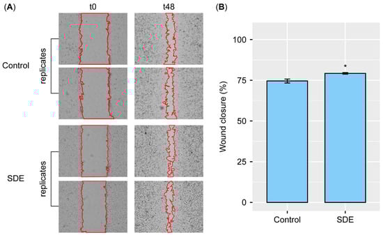 SDEs enhance wound healing in HaCaT cells. (A) Representative images showing closure of artificial wounds in HaCaT cells treated with either PBS (control) or SDEs over a 48 h period. (B) Bar graph illustrating a significantly higher percentage of wound closure observed in SDE-treated cells compared to the control group at 48 h. * indicates statistically significant differences at p < 0.05.