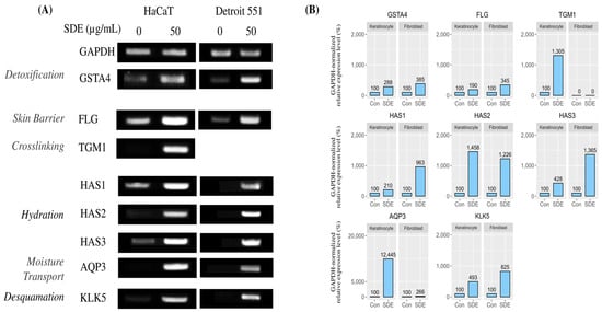 Effect of SDE treatment on skin barrier-related gene expression in HaCaT and Detroit 551 cells. (A) Agarose gel electrophoresis showing expression levels of GAPDH and various skin barrier-related genes in HaCaT and Detroit 551 cells following treatment with 50 µg/mL SDEs. (B) Quantification of band intensities from panel (A), demonstrating relative expression levels of target genes normalized to GAPDH. “Con” denotes the untreated control group, which received no SDE treatment and serves as a baseline for comparison.
