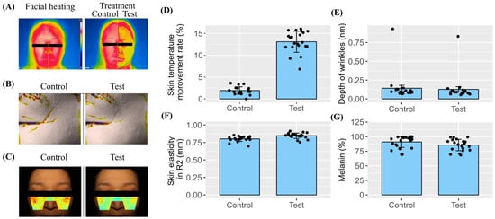 The primary finding of this skin assessment was that no adverse reactions—such as redness, edema, scaling, itching, pain, or burning sensation—were observed in any participants after initial application or throughout the subsequent two-week period (Table 1). The results demonstrated a significant cooling effect across all the patients, with a maximum improvement of 16.04%, and minimum and median rates of 6.82% and 12.96%, respectively (Figure 4A,D). A statistically significant reduction in the depth of periorbital wrinkles was reported among all the subjects, with improvements ranging from 4.76% to 25.74%, highlighting the effectiveness of the SDEs in wrinkle reduction (Figure 4B,E). Moreover, the application of prototype cosmetics containing the SDEs significantly enhanced skin elasticity (Figure 4F). Finally, a significant decrease in melanin levels was observed after two weeks of the topical administration of the SDE-containing prototypes (Figure 4G), indicating potential benefits for pigmentation issues. In summary, these findings suggest that SDEs can provide substantial benefits for skin health by enhancing cooling effects, reducing wrinkles, improving elasticity, and reducing pigmentation levels without side effects.