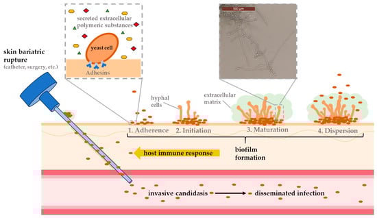 Schematic representation of biofilm development based on the four main steps (adhesion, initiation, maturation and dispersion) and an exemplary illustration showing typical invasive candidiasis infection caused by skin lesions upon the use of, e.g., medical devices.