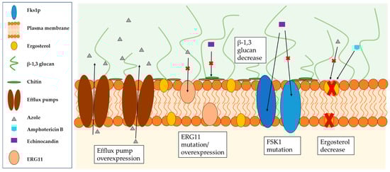 Schematic representation of the biofilm-specific reduced sensitivity of Candida species to azoles, amphotericin B and echinocandins due to efflux pump overexpression, ERG11 mutation/overexpression (gene encodes lanosterol 14α-demethylase), the mutation of Fsk1 (gene encodes (1,3)-β-D-glucan synthase) and decreased levels of ergosterol and β-1,3 glycans.