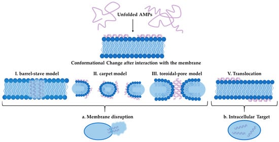 Illustration of AMP mechanism of action. Unfolded AMP interacts with cell membrane and undergoes a conformational change. Afterwards, the peptide can be translocated into the cell to act intracellularly or distribute the membrane following the barrel-stave model, the carped model or the toroidal pore model.