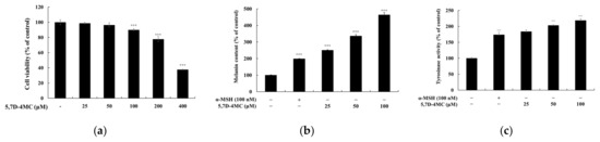 To determine the safe concentrations of 5,7D-4MC, its cytotoxicity was evaluated in B16F10 melanoma cells using the 3-(4,5-dimethylthiazol-2-yl)-2,5-diphenyltetrazolium bromide (MTT) assay. The cells were treated with 5,7D-4MC at concentrations ranging from 25 to 400 μM. As shown in Figure 2a, no apparent cytotoxicity was observed in B16F10 cells at concentrations of 25, 50, and 100 μM. Even at the highest concentration of 100 μM, cell viability remained above 90%. Therefore, we conclude that 5,7D-4MC is not toxic to B16F10 cells at concentrations below 100 μM. Subsequent experiments were conducted using 5,7D-4MC at concentrations of 25, 50, and 100 μM, all of which showed no cytotoxic effects. Next, we examined the effect of 5,7D-4MC on melanin synthesis by measuring the melanin content in the cells after incubation with 5,7D-4MC at different concentrations (25, 50, and 100 μM) for 72 h. Alpha-melanocyte-stimulating hormone (α-MSH), a major factor that stimulates melanin synthesis in the skin, was used as a positive control. As shown in Figure 2b, melanin content in the positive control group increased by approximately 198.0% compared to the untreated control group. In comparison, the 5,7D-4MC-treated groups (25, 50, and 100 μM) showed increases in melanin content of 250.1%, 336.0%, and 463.0%, respectively. These results demonstrate that melanin levels were significantly increased by 5,7D-4MC in a concentration-dependent manner, indicating that 5,7D-4MC stimulates melanogenesis in B16F10 cells without causing cytotoxicity.