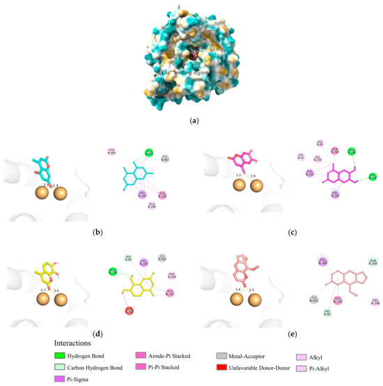 Molecular docking analysis of mTYR–ligand complexes. (a) Copper ion binding region of mushroom tyrosinase, (b) Binding interaction of mTYR-5,7D-4MC complex, (c) Binding interaction of mTYR-6,7D-4MC complex, (d) Binding interaction of mTYR-7,8D-4MC complex, (e) Binding interaction of mTYR-8-MOP complex.