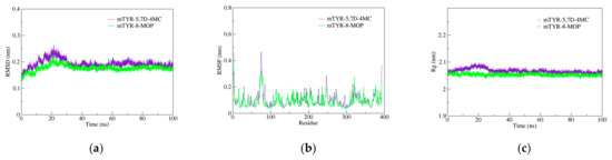 Based on molecular docking analysis, 5,7D-4MC and 8-MOP exhibit similar binding modes within mTYR. MD simulations were subsequently performed to compare the stability and binding strength of the two complexes. In terms of RMSD, both complexes reached a relatively stable state at approximately 30 ns, with RMSD values stabilizing at 0.20 ± 0.05 nm (Figure 4a). RMSF analysis identified the flexible regions primarily within the 70–80 residue range, with fluctuation amplitudes below 0.5 nm, indicating that ligand binding did not induce significant structural perturbations in the protein (Figure 4b). Moreover, analyses of the radius of gyration (Rg, Figure 4c) and solvent-accessible surface area (SASA, Figure 4d) showed nearly overlapping curves for both complexes, reflecting comparable thermodynamic stability and conformational dynamics. Regarding the hydrogen bond analysis, the mTYR-5,7D-4MC complex consistently maintained a single stable hydrogen bond throughout the simulation (Figure 4e), whereas the mTYR-8-MOP complex displayed relatively stable hydrogen bonding only during the 80–100 ns interval (Figure 4f). Principal component analysis (PCA) revealed that the first three principal components accounted for 34.1% and 27.9% of the total variance in the mTYR-5,7D-4MC and mTYR-8-MOP complexes, respectively (Figure 4g,h). The axes represent the protein’s conformational space, with each dot showing a configuration. The blue-to-red color gradient indicates the simulation’s progression, from start (blue) to end (red). The slightly higher variance observed for the 5,7D-4MC complex suggests more notable conformational changes. Dynamic cross-correlation matrix (DCCM) analysis further highlighted significant differences in correlated motions between the two complexes. The mTYR-5,7D-4MC complex exhibited more significant positive (light blue) and negative (pink) correlated motions in the 200–350 residue region (Figure 4i), whereas the mTYR-8-MOP complex (Figure 4j) displayed a higher degree of conformational stability.