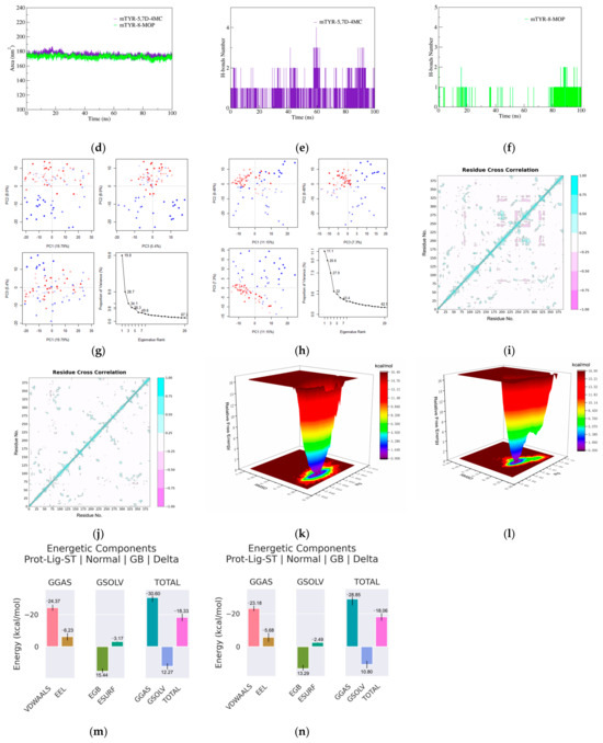 Molecular dynamics simulation analysis of mTYR–ligand complexes. (a) RMSD plot of mTYR–ligand complexes, (b) RMSF plot of mTYR–ligand complexes, (c) Rg plot of mTYR–ligand complexes, (d) SASA plot of mTYR–ligand complexes, (e) H-bonds analysis of mTYR-5,7D-4MC complex, (f) H-bonds analysis of mTYR-8-MOP complex, (g) PCA of mTYR-5,7D-4MC complex, (h) PCA of mTYR-8-MOP complex, (i) DCCM analysis of mTYR-5,7D-4MC complex, (j) DCCM analysis of mTYR-8-MOP complex, (k) Gibbs free energy landscape of mTYR-5,7D-4MC complex, (l) Gibbs free energy landscape of mTYR-8-MOP complex, (m) Binding free energy of mTYR-5,7D-4MC complex, (n) Binding free energy of mTYR-8-MOP complex.