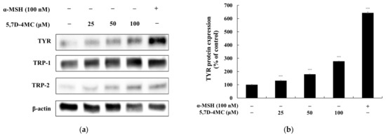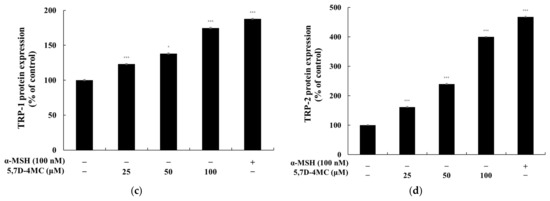 Since 5,7D-4MC treatment increased tyrosinase activity, the protein expression level of tyrosinase in B16F10 cells was evaluated using Western blotting. At 72 h after treatment with 5,7D-4MC, tyrosinase expression was significantly increased in a concentration-dependent manner. Tyrosinase-related proteins TRP-1 and TRP-2 also play important roles in regulating melanin synthesis; therefore, we examined the expression of TRP-1 and TRP-2 using Western blotting. As shown in Figure 5, 5,7D-4MC treatment led to an increase in the expression of both proteins. In particular, after treatment with 100 μM 5,7D-4MC, tyrosinase, TRP-1, and TRP-2 protein expression levels increased by approximately 177.0%, 74.7%, and 299.6%, respectively, compared to the untreated control. Notably, after treatment with 100 μM 5,7D-4MC, the expression levels of TRP-1 and TRP-2 increased to a level nearly comparable to that of the 100 nM control group. Taken together, these results indicate that 5,7D-4MC stimulates melanogenesis by positively regulating the expression of melanogenic proteins.