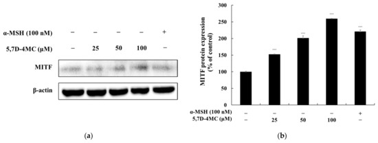 MITF is a key regulator of melanogenesis, controlling the expression of melanogenic genes such as tyrosinase, TRP-1, and TRP-2 by binding to the M-box motif in their promoter regions [4,5,6]. To further elucidate the role of MITF in 5,7D-4MC-induced melanogenesis, we examined its protein expression following treatment. As shown in Figure 6, MITF expression levels in B16F10 cells increased in a concentration-dependent manner after exposure to 5,7D-4MC. Notably, at a concentration of 100 μM, MITF protein expression was approximately 159.7% higher than that of the untreated control group. These findings indicate that MITF plays a critical role in mediating the melanogenic effects of 5,7D-4MC.