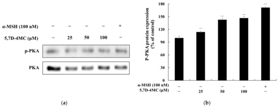 α-MSH binds to the melanocortin 1 receptor (MC1R), triggering an increase in intracellular cyclic adenosine monophosphate (cAMP) levels. Elevated cAMP activates protein kinase A (PKA), which subsequently phosphorylates and activates the cAMP response element-binding protein (CREB). Activated CREB enhances the expression of MITF, leading to the transcriptional activation of tyrosinase, TRP-1, and TRP-2—key genes involved in melanin synthesis. This cascade ultimately enhances melanin production, regulating cellular pigment synthesis [23,24]. To determine whether 5,7D-4MC influences the cAMP-PKA signaling pathway in B16F10 cells, we performed Western blot analysis to assess its effect on PKA phosphorylation. As shown in Figure 7, treatment with 5,7D-4MC at all tested concentrations led to a significant increase in PKA expression, exceeding 46.8% compared to the untreated control group. These findings suggest that 5,7D-4MC promotes melanogenesis through activation of the cAMP-PKA signaling pathway.