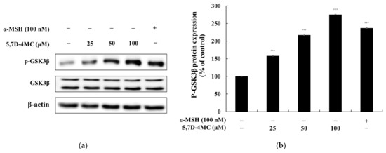 Previous studies have demonstrated the pivotal role of GSK3β in regulating melanogenesis via the Wnt/β-catenin signaling pathway. When Wnt ligands bind to their receptors, GSK3β is inactivated, preventing the phosphorylation and subsequent degradation of β-catenin. This allows β-catenin to accumulate in the cytoplasm and translocate into the nucleus, where it stimulates MITF expression. MITF, in turn, enhances the transcription of key melanogenic genes, including tyrosinase, TRP-1, and TRP-2, thereby promoting melanin synthesis. To determine whether 5,7D-4MC influences GSK3β activity, we examined its effect on GSK3β phosphorylation levels. As shown in Figure 8, treatment with 5,7D-4MC resulted in a concentration-dependent increase in GSK3β phosphorylation. These findings suggest that 5,7D-4MC enhances pigmentation by upregulating MITF expression through the GSK3β signaling pathway [25].