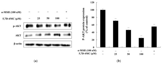 The effect of 5,7D-4MC on AKT protein expression in α-MSH-stimulated B16F10 cells. AKT expression was determined by Western blot analysis. (a) Western blot results, (b) p-AKT/AKT protein expression. α-MSH (100 nM) was used as a positive control. The relative intensity of the protein bands was quantified using ImageJ software, and the values were normalized to the corresponding loading control. Untreated cells were set as 100%. Data are presented as the mean ± SD of at least three independent experiments. * p < 0.05, ** p < 0.01, *** p < 0.001 compared to the α-MSH alone group.