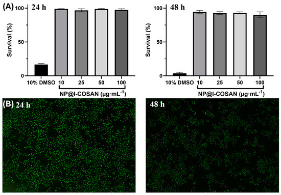 (A) Bar graphs indicating the percentage of HeLa cell survival after 24 h (left) and 48 h (right) of treatment with four different concentrations (10, 25, 50, and 100 μg∙mL−1) of NP@I-COSAN and the positive control (DMSO 10 vol. %), error bars mean ± 5%. (B) Fluorescence microscopy photographs of the LIVE/DEAD experiments of HeLa cells after being incubated for 24 h (left) and 48 h (right) with 100 μg∙mL−1 NP@I-COSAN.