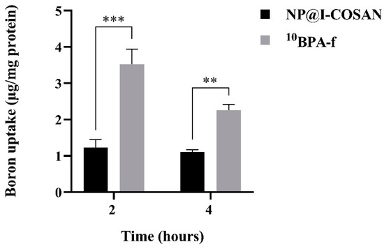 Boron uptake in HeLa cells was evaluated after exposure to 0.045 ppm of 10B-NP@I-COSAN and 25 ppm of 10BPA-f for 2 and 4 h. (**) p < 0.01 and (***) p < 0.001, according to the two-way ANOVA analysis (Tukey’s test).