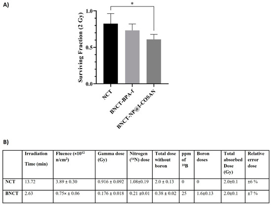(A) Cell survival after treatment with 0.045 ppm of 10B-NP@I-COSAN and 25 ppm of 10BPA-f, post-neutron irradiation (2 Gy). (B) Dosimetry for thermal neutron irradiation without and with boron (25 ppm 10B). Note: Dosimetry for the BNCT groups is based on BPA-f, which has a boron-10 concentration of 25 ppm. (*) p < 0.05, according to the two-way ANOVA analysis (Tukey’s test).