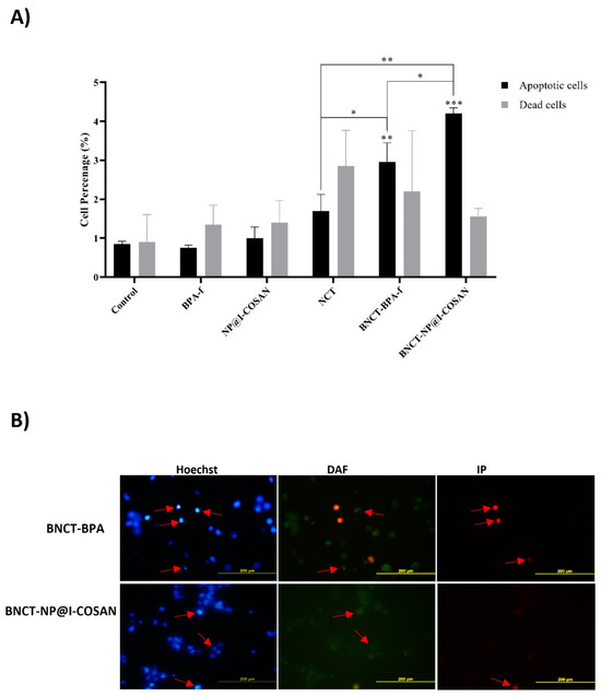 This study investigated the mechanisms of cell death induced by 10BPA-f and 10B-NP@I-COSAN within the context of the BNCT (Figure 6). The evaluation of these mechanisms was carried out at a dose of 2 Gy, 48 h post-neutron irradiation, along with a concentration of 0.045 ppm of 10B-NP@I-COSAN and 25 ppm of 10BPA-f. The effect of both treatments on HeLa cell death levels was analyzed using fluorescence microscopy. The results demonstrate a marked increase in cell death through apoptosis and necrosis across all treatments involving neutron activation. Remarkably, when HeLa cells were exposed to neutron capture treatment (NCT) alone, they displayed necrosis. In contrast, exposure to boron neutron capture therapy with 10BPA-f or 10B-NP@I-COSAN resulted in an increased number of apoptotic cells. This finding suggests that incorporating boron compounds enhances the efficacy of cell death mechanisms compared to NCT alone. Furthermore, compared to the 10BPA-f and NCT-only groups, treatment with BNCT-10B-NP@I-COSAN resulted in a statistically significant increase in apoptotic cell death. These findings underscore the critical role of boron delivery systems in BNCT and highlight the enhanced apoptotic response associated with 10B-NP@I-COSAN. Future research will aim to elucidate the mechanisms underlying this enhanced response and explore the potential clinical applications of these results in cancer treatment.