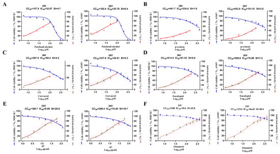 In vitro safety and antiviral activity. (A–F) Dose–response curves for half-maximal inhibitory concentration (IC50), half-maximal cytotoxic concentration (CC50), and selectivity index (SI) of patchouli alcohol, carvacrol, p-cymene, eucalyptol, AC, and oseltamivir against IAV. The cytotoxicity of six drug groups against the MDCK and A549 cells was determined using a CCK8 assay (n = 3).