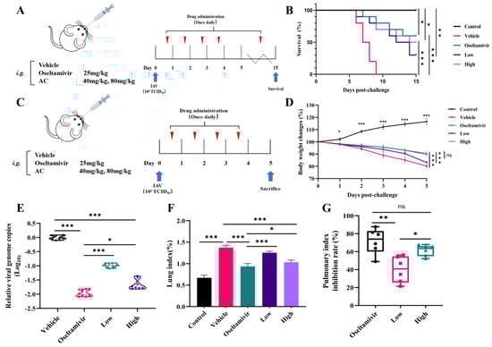 AC protects mice infected with influenza virus. (A) Scheme of once-daily dosing for 14 consecutive days after infecting mice with the 103TCID50 IAV PR8 strain via nose drops (n = 10). (B) Survival rates (expressed as percentages) of IAV-challenged mice through treatment with oseltamivir and AC (n = 10). (C) Scheme of once-daily dosing for 4 consecutive days after using nose drops infected with the 103TCID50 IAV PR8 strain in mice (n = 10). (D) Effect of treatment with oseltamivir and AC on the recovery of body weight in IAV-infected mice (n = 10). (E) Reduction in IAV genome copy number in lungs sampled from IAV-challenged mice through treatment with AC (n = 8). (F,G) Lung index and lung index inhibition in H1N1 mice after AC treatment (n = 6). The data are presented as the mean ± SD, * p < 0.05, ** p < 0.01, *** p < 0.001, ns: not significant.