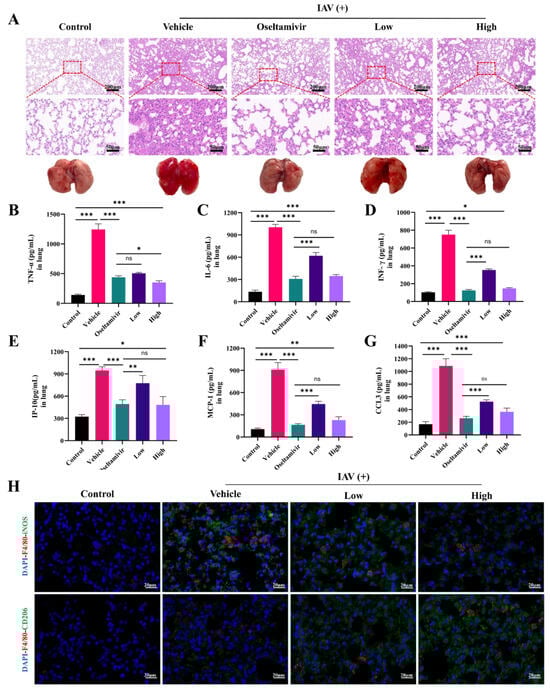 AC attenuates IAV-induced pulmonary inflammation in mice with ALIs. (A) Representative images showing histopathological changes in the lung tissues and their amelioration following the AC treatment (upper panel scale bar = 200 μm, lower panel scale bar = 50 μm, n = 3). (B–G) The expression of TNF-α, IL-6, INF-γ, IP-6, MCP-1, and CCL3 in the pulmonary tissue was evaluated in each group (n = 6). (H) Lung tissue F4/80 (red) and iNOS (green) expression and lung tissue F4/80 (red) and CD206 (green) expression after AC treatment of the IAV-infected mice (scale bar = 20 μm, n = 3). The data are presented as the mean ± SD, * p < 0.05, ** p < 0.01, *** p < 0.001, ns: not significant.