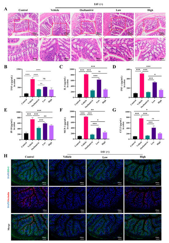 Numerous studies [11,12] have shown that different types of respiratory viruses cause lung damage, as well as intestinal inflammation. Therefore, we investigated the ameliorative effect of AC on the intestinal inflammation and barrier dysfunction in the H1N1-infected mice. Compared with these properties in the control group, the colons in the group with IAV-induced ALIs also exhibited significant inflammatory cell infiltration and crypt disruption, and these histopathological changes in the colons were ameliorated by the oseltamivir and AC treatments (Figure 4A). Moreover, the levels of the inflammatory indicators TNF-α, IL-6, IFN-γ, IP-10, MCP-1, and CCL3 were significantly elevated in the colons of the vehicle group mice. However, oseltamivir and the AC treatment (especially at high doses) significantly suppressed the expression of these inflammatory indicators (Figure 4B–G). These results suggest that AC has potent anti-inflammatory effects on the colonic tissues of mice with IAV-induced ALIs.