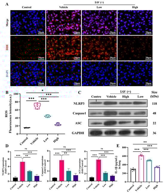 Oxidative stress is a common consequence of inflammatory responses and is associated with elevated ROS levels. These high ROS levels not only cause damage to the epithelial cells but also stimulate the assembly and activation of the NLRP3 inflammasome complex and enhance the overall immune response [42]. The present study demonstrated that the accumulation of ROS in the lungs was significantly elevated after influenza virus infection (Figure 5A,B). Furthermore, the administration of the AC treatment, particularly in the high-dose group, markedly inhibited the increase in ROS and restored them to normal levels. In parallel, the protein expression of NLRP3, ASC, and caspase-1 was significantly upregulated in the lungs following viral invasion (Figure 5C,D). However, this trend was reversed in the high-dose AC treatment group, where the NLRP3 inflammasome was significantly downregulated in conjunction with IL-1β (Figure 5E). Overall, AC can exert anti-inflammatory effects and ameliorate IAV-induced ALIs by inhibiting the expression of ROS, thereby suppressing the activation of the NLRP3/ASC/caspase-1 pathway.