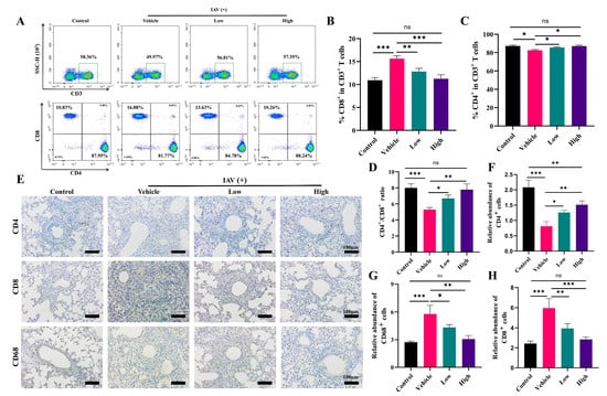 In patients with influenza virus and other respiratory viral infections, the massive infiltration of immune cells and the consequent secretion of excessive proinflammatory cytokines, resulting in dysregulation of the immune system, can be observed. The results showed significant activation of the CD8+ T-cells in the peripheral blood of the mice after IAV infection, while there was a decrease in the number of CD4+ T-cells in the peripheral blood (Figure 6A–D), as well as cytokine storm production (Figure 6B–G), which was consistent with previous reports [43,44]. The AC treatment was effective in reversing this phenomenon in the peripheral blood and spleens (Figure S1) of the model mice.