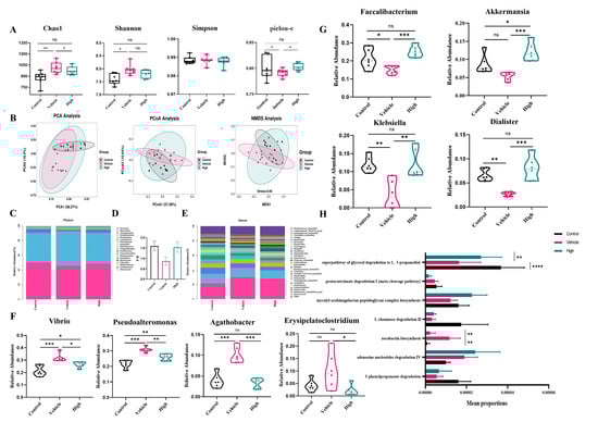 AC’s modulation of the gut microbiota in mice with IAV-induced ALIs and analysis of species differences. (A) α-diversity analysis (n = 6) and (B) PCA, PCoA of the weighted unifrac, and NMDS analysis based on the Bray–Curtis distance algorithm for the control, vehicle, and high-dose AC treatment groups (n = 9). (C) Differences in the gut microbiota at the phylum level. (D) The ratio of Firmicutes/Bacteroidetes (F/B) in the three groups of mice (n = 6). (E) The relative abundance of the differential microbiomes between the control and vehicle groups at the genus level was found to be significantly regulated by AC. (F) Inhibitory effect of AC on conditionally pathogenic intestinal bacteria after IAV infection (n = 6). (G) Effect of AC on intestinal probiotics after IAV infection (n = 6). (H) Functional enrichment of differential flora at the pathway level. The data are presented as the mean ± SD, * p < 0.05, ** p < 0.01, *** p < 0.001, **** p < 0.0001, ns: not significant.