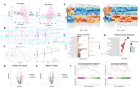 Lipid metabolism analysis of the effect of AC on sera from mice with IAV-induced ALIs. (A) PCA and PLS-DA (B,C) score plots of the serum lipid metabolite profiles between the different groups. Volcano plots of differential metabolites between (D) control and vehicle groups and (E) high-dose and vehicle groups, where red represents upregulated significantly differentially expressed metabolites, blue represents downregulated significantly differentially expressed metabolites, and gray dots represent non-significantly differentially expressed metabolites. (F) Heat map of differential metabolites between the control and vehicle and AC (high-dose) and vehicle groups. (G) KEGG enrichment analysis, (H) enrichment scatter plot, and KEGG-enriched ES fold plot (I) showed the changes in the lipid metabolic process in the serum after the AC treatment (Red represents genes enriched in the AC treatment group, and green represents genes enriched in the model group). The data are presented as the mean ± SD, n = 6.