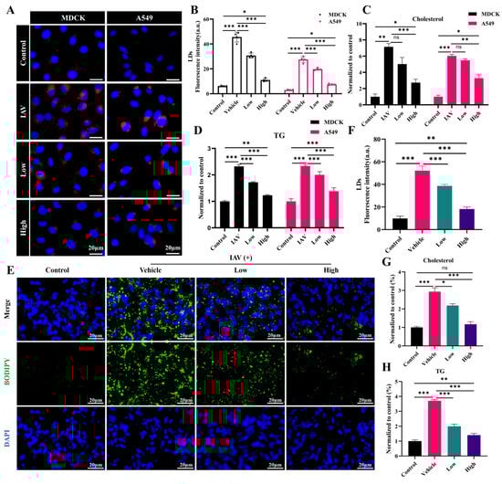 AC suppressed the abnormal IAV-induced accumulation of LDs. (A,B) The effect of AC on the accumulation of LDs. (C) Cholesterol and (D) TG levels in the MDCK and A549 cells after IAV infection. (E,F) The effect of AC on the accumulation of LDs and (G) cholesterol and (H) TG levels in the lung tissue of mice with IAV-induced ALIs. The data are presented as the mean ± SD, n = 4. * p < 0.05, ** p < 0.01, *** p < 0.001, ns: not significant.
