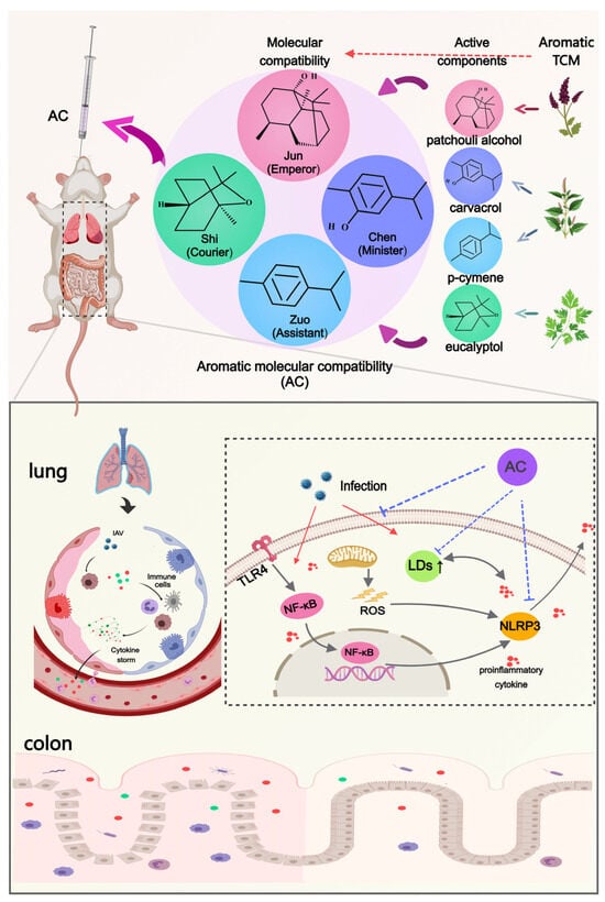 Background: Acute lung injury (ALI) is a major cause of death in patients with various viral pneumonias. Our team previously identified four volatile compounds from aromatic Chinese medicines. Based on molecular compatibility theory, we defined their combination as aromatic molecular compatibility (AC), though its therapeutic effects and underlying mechanisms remain unclear. Methods: This study used influenza A virus (IAV) A/PR/8/34 to construct cell and mouse models of ALI to explore AC’s protective effects against viral infection. The therapeutic effect of AC was verified by evaluating the antiviral efficacy in the mouse models, including improvements in their lung and colon inflammation, oxidative stress, and the suppression of the NLRP3 inflammasome. In addition, 16S rDNA and lipid metabolomics were used to analyze the potential therapeutic mechanisms of AC. Results: Our in vitro and in vivo studies demonstrated that AC increased the survival of the IAV-infected cells and mice, inhibited influenza virus replication and the expression of proinflammatory factors in the lung tissues, and ameliorated barrier damage in the colonic tissues. In addition, AC inhibited the expression of ROS and the NLRP3 inflammasome and improved the inflammatory cell infiltration into the lung tissues. Finally, AC effectively regulated intestinal flora disorders and lipid metabolism in the model mice, significantly reduced cholesterol and triglyceride expression, and thus reduced the abnormal accumulation of lipid droplets (LDs) after IAV infection. Conclusions: In this study, we demonstrated that AC could treat IAV-induced ALIs through multiple pathways, including antiviral and anti-inflammatory pathways and modulation of the intestinal flora and the accumulation of LDs.