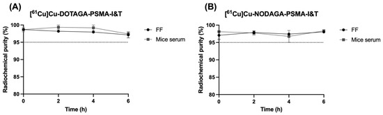 Stability results for (A) [61Cu]Cu-DOTAGA-PSMA-I&T and (B) [61Cu]Cu-NODAGA-PSMA-I&T in the final formulation and after incubation with mice serum over a period of 6 h after the EOS. Data are expressed as mean ± SEM (N = 3–6). FF: final formulation.