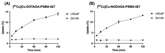 Cellular uptake of (A) [61Cu]Cu-DOTAGA-PSMA-I&T and (B) [61Cu]Cu-NODAGA-PSMA-I&T in PSMA-positive (LNCaP) and PSMA-negative (DU145) cells. Data are presented as mean ± SEM (N = 2–5).