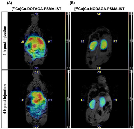 The in vivo biodistribution of both [61Cu]Cu-DOTAGA-PSMA-I&T and [61Cu]Cu-NODAGA-PSMA-I&T was evaluated in healthy control mice by PET/MRI. Whole-body images were acquired at 1 h and 4 h post intravenous injection of the radiopharmaceuticals. The biodistribution profiles of the two radiolabeled compounds differed significantly, as shown in Figure 4. [61Cu]Cu-DOTAGA-PSMA-I&T was predominantly retained in the abdominal region, particularly in the liver and gastrointestinal tract (Figure 4A), whereas [61Cu]Cu-NODAGA-PSMA-I&T showed a more favorable pattern of uptake, with prominent accumulation in the kidneys (Figure 4B) and the urinary bladder. These results were validated by ex vivo biodistribution studies performed immediately after image acquisition at the latest time point. While [61Cu]Cu-NODAGA-PSMA-I&T was confirmed to accumulate preferably in the kidneys and urine with residual uptake in non-targeted organs, [61Cu]Cu-DOTAGA-PSMA-I&T exhibited a very scattered accumulation in various non-targeted organs, including the liver, stomach, and small and large intestines (Figure S1). The biodistribution profile of [61Cu]Cu-DOTAGA-PSMA-I&T resemble that of [61Cu]CuCl2, consistent with excretion via the hepatobiliary system, and previously reported by Bernabeu et al. [14]. These findings suggest that the stability of [61Cu]Cu-DOTAGA-PSMA-I&T may be compromised in vivo, as copper-61 appears to undergo transchelation and decomplexation from the DOTAGA chelator. Considering these results, PET/MR imaging studies in tumor-bearing mice were conducted with [61Cu]Cu-NODAGA-PSMA-I&T.