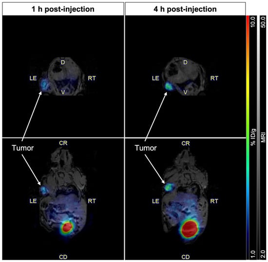 PET/MR images acquired 1 h and 4 h after intravenous injection of [61Cu]Cu-NODAGA-PSMA-I&T into the tail vein of mice bearing PSMA-positive tumor xenografts are shown in Figure 5. At 1 h post-injection, a selective accumulation of the radiopharmaceutical was clearly visible in the left shoulder, co-localizing precisely with the PSMA-expressing tumor mass visualized by MRI. At 4 h post-injection, a marked increase in signal intensity was observed and supported by PET quantification, which revealed a significant rise in tumor uptake from 3.27% to 6.00% ID/g over this time period. Consistent with the observations in control mice, no radiopharmaceutical accumulation was detected in non-targeted organs or tissues, apart from the kidneys (not pictured) and the urinary bladder. Uptake in the kidneys, urine, and tumors was further confirmed by ex vivo biodistribution (Figure S1).