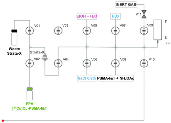 Schematic flow of Synthera® Extension module for the synthesis of [61Cu]Cu-PSMA-I&T radiopharmaceuticals. The red dot connects to the red dot in Figure 6. Strata-X: cartridge used for purification; FPV: final product vial; V01–11: valves 1–11.
