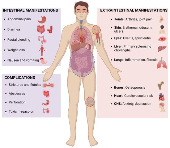- Vavricka, S.R.; Schoepfer, A.; Scharl, M.; Lakatos, P.L.; Navarini, A.; Rogler, G. Extraintestinal Manifestations of Inflammatory Bowel Disease. Inflamm. Bowel Dis. 2015, 21, 1982–1992. [Google Scholar] [CrossRef] [PubMed]