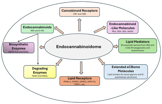 The ECS was originally associated with neurotransmission, pain modulation, appetite regulation, and immune responses. However, as research advanced, it became evident that additional lipid mediators, receptors, and metabolic enzymes interact with these classical components. This led to the recognition of a broader signaling network, termed the endocannabinoidome [136]. eCBome includes lipid-derived mediators synthesized from membrane phospholipids through enzymatic pathways similar to those producing classical endocannabinoids like AEA and 2-AG. To be classified within this system, these molecules must interact with cannabinoid receptors (CB1 and CB2) or functionally related receptors such as PPARs (peroxisome proliferator-activated receptors), TRPV1 (transient receptor potential vanilloid 1), and G-protein coupled receptors (GPR35, GPR55, GPR119). They must also undergo metabolic processes regulated by enzymes such as NAPE-PLD, DAGL, FAAH, and MAGL and influence physiological processes, including inflammation, metabolism, pain modulation, and gut barrier integrity [13,23,27]