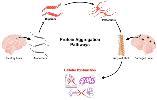 A cascade of progressive protein aggregation in neurodegenerative pathogenesis. The process initiates in the healthy brain with native protein monomers, which undergo conformational changes leading to oligomerization. These oligomeric intermediates further aggregate into protofibrils, ultimately assembling into highly ordered amyloid fibrils. This terminal aggregation state correlates with observable neuropathology, characterized by distinct patterns of brain damage. The downstream of cellular consequences of protein aggregation, includes disruption of essential neuronal functions: protein quality control mechanisms, mitochondrial homeostasis, axonal transport efficiency, and synaptic transmission integrity. This cascade represents a crucial mechanistic framework in understanding the molecular basis of neurodegenerative disorders and identifies potential therapeutic intervention points along the aggregation pathway. Created in BioRender. Kciuk, M. (2025) https://BioRender.com/g29m614 (accessed on 19 February 2025).