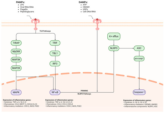 Molecular mechanisms of neuroinflammatory signaling cascades in neurodegeneration. Converging molecular pathways mediating neuroinflammatory responses in neurodegenerative conditions have two primary inflammatory triggers: pathogen-associated molecular patterns (PAMPs) and damage-associated molecular patterns (DAMPs), which initiate distinct but interconnected signaling cascades across the cellular membrane. PAMPs (pathogen-associated molecular patterns), including LPS, viral RNA/DNA, flagellin, and peptidoglycans, initiate inflammation through TLR-mediated signaling. This process branches into two main cascades: TIRAP–MyD88-MAP3K–MAP2K–MAPK and TRIF–TBL1–IRF3. Both pathways converge to activate NF-κB, triggering the expression of pro-inflammatory genes. These include critical cytokines (TNF-α, IL-1β, IL-6, IL-8), chemokines (CCL2, CXCL8), and inflammatory mediators (COX-2, iNOS, PGE2). Simultaneously, DAMPs (damage-associated molecular patterns) such as ATP, HMGB1, HSPs, and cellular DNA/RNA activate a separate inflammatory cascade through the NLRP3 inflammasome. This process begins with potassium efflux, which triggers NLRP3 activation, followed by ASC recruitment and pro-caspase-1 processing. The end result is active caspase-1, which promotes the expression of inflammatory mediators, particularly GSDMD and HMGB1. PAMPs = pathogen-associated molecular patterns, LPS = lipopolysaccharide, RNA = ribonucleic Acid, DNA = deoxyribonucleic acid, TLR = toll-like receptor, TIRAP = TIR domain-containing adaptor protein, MyD88 = myeloid differentiation primary response 88, MAP3K = mitogen-activated protein kinase kinase kinase, MAP2K = mitogen-activated protein kinase kinase, MAPK = mitogen-activated protein kinase, TRIF = TIR domain-containing adapter-inducing interferon-β, TBL1 = transducin beta-like 1, IRF3 = interferon regulatory factor 3, NF-κB = nuclear factor kappa-light-chain-enhancer of activated B cells, TNF-α = tumor necrosis factor alpha, IL-1β = interleukin-1 beta, IL-6 = interleukin-6, IL-8 = interleukin-8, CCL2 = C-C motif chemokine ligand 2, CXCL8 = C-X-C motif chemokine ligand 8, COX-2 = cyclooxygenase-2, iNOS = inducible nitric oxide synthase, PGE2 = prostaglandin E2, DAMPs = damage-associated molecular patterns, ATP = adenosine triphosphate, HMGB1 = high mobility group box 1, HSPs = heat shock proteins, NLRP3 = NOD-like receptor protein 3, ASC = apoptosis-associated speck-like protein containing a CARD, GSDMD = gasdermin D, K+ = potassium. Created in BioRender. Kciuk, M. (2025) https://BioRender.com/zb9c38p (accessed on 27 March 2025).