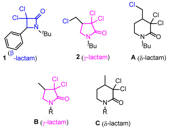 Lactams, particularly β-lactams, are well known for their antibiotic properties but have also demonstrated their potential as anticancer agents. Recent studies have explored β-lactam derivatives for their therapeutic applications in cancer treatment, focusing on their mechanisms of action and structure–activity relationships [1]. Notably, certain β-lactam analogs have been shown to induce apoptosis in cancer cells by disrupting microtubule organization, leading to mitotic arrest [2]. Four years ago, we started an investigation into the synthesis and screening of a group of 3,3-dichloro-β-lactams regarding their cytotoxic activity against cancer cell lines [3]. After an evaluation of their effects on cell viability and their potential mechanisms of action using different endpoint methods, compound 1 (Figure 1) was found to be the most cytotoxic, showing the lowest IC50 values (20–49 g/mL and 30–47 g/mL) for the HaCaT and A431 cell lines, respectively. Thereafter, we extended our investigation to 4-(chloromethyl)-3,3-dichloro-γ-lactams prepared through atom transfer radical cyclization (ATRC) from tethered alkenyl trichloroacetamides in the presence of catalytic RuCl2(PPh3)3 and under microwave activation [4]. The investigation was undertaken on four 3,3-dichloro-γ-lactams, featuring different substituents on the nitrogen, along with δ-lactam A. Among the five products, γ-lactam 2 (Figure 1) exhibited the lowest IC50 values (100–250 µg/mL), with promising selectivity against squamous carcinoma cells (A431) in comparison with the fibroblast (3T3) cell line.